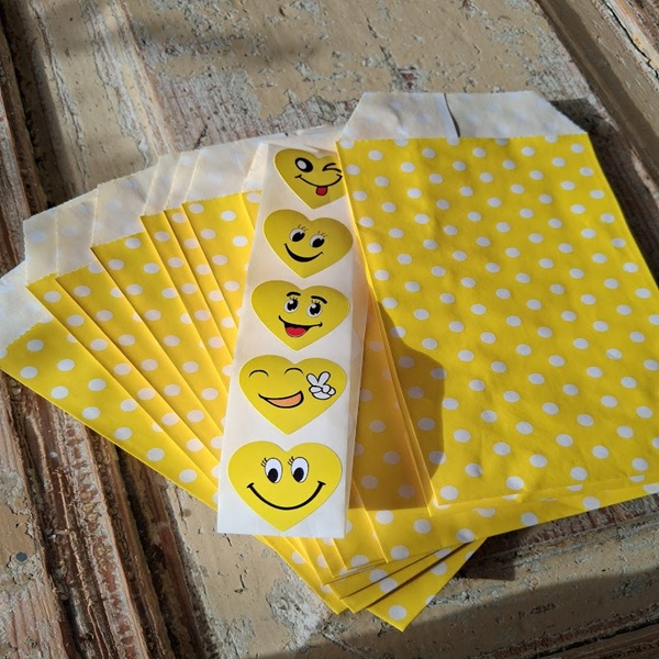 Kraftpapperspåse (15 x 8 cm) & sticker, 10 pack. Färgglad design som passar vid flera olika tillfällen. Passar utmärkt för pyssel eller som förpackning till små presenter.